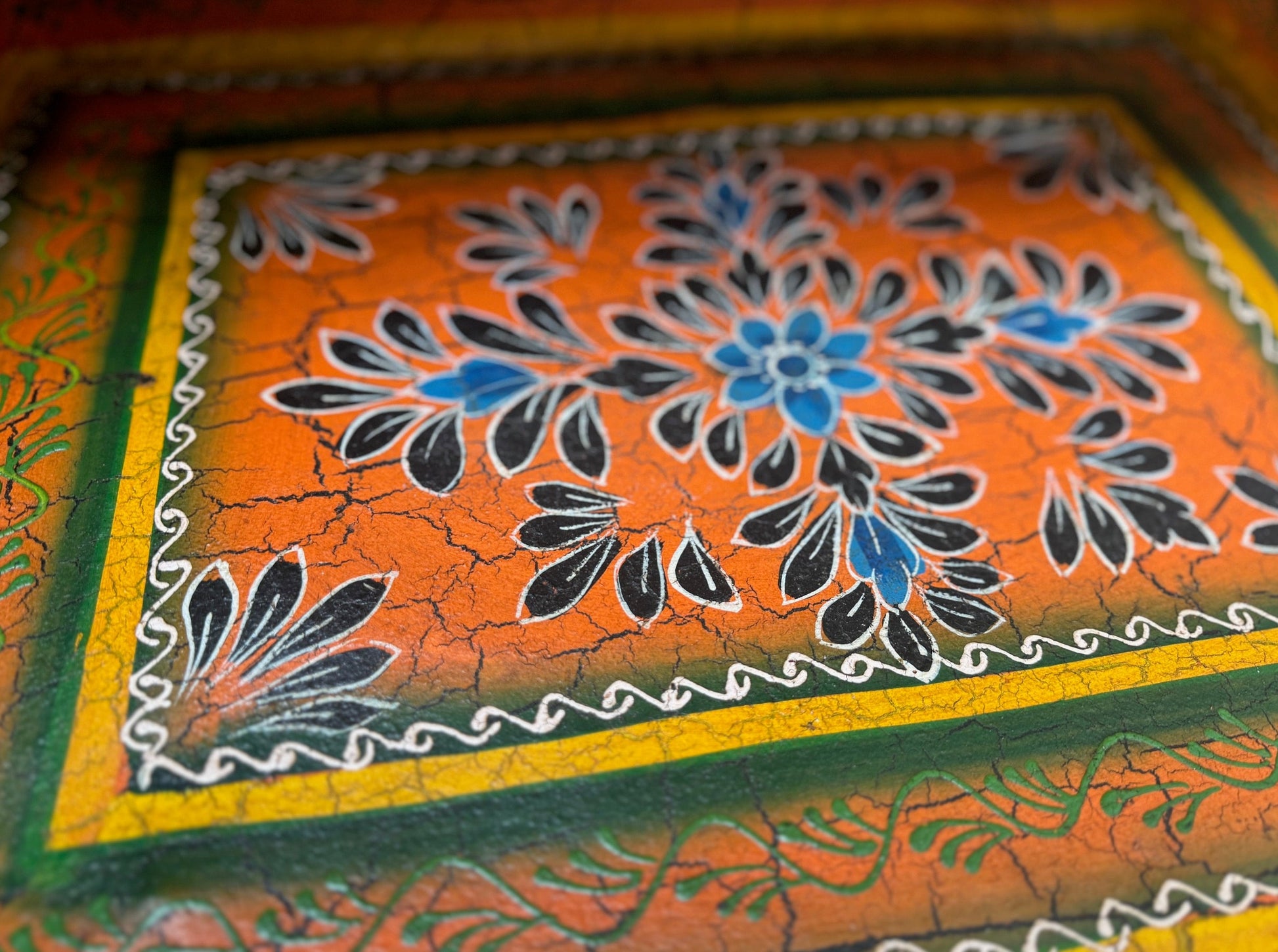 Expertly handcrafted metal trunks in vibrant shades, adorned with intricate leafy floral patterns. A stylish storage solution.
