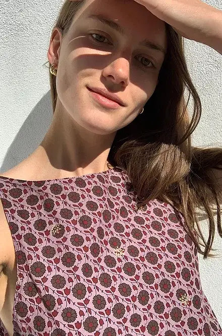 Natural dye block print cotton shift dress with details that are hand painted on. This fabric is made in Jaipur, Rajasthan, the home of block printing. This shift dress is a flattering and easy summer style. It has a low back that meets the bra line to give you options.